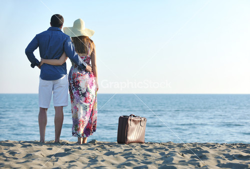 couple on beach with travel bag