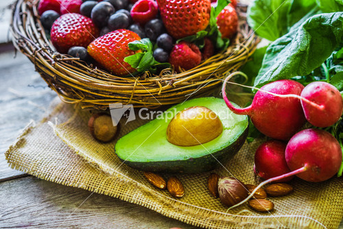Fruits and vegetables on rustic background
