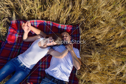 happy couple in wheat field