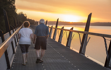 older couple walking at sunset